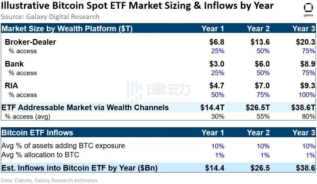 相关阅读:《[url=]Galaxy Digital:重新评估比特币 ETF 的市场规模[/url]》 我们假设 RIA 渠道将从第一年开始以 50% 的准入份额逐渐增加到第三年达到 100%。对于经纪商和银行渠道,我们假设在第一年以 25% 的准入份额开始,逐渐增加到第三年的 75%。根据这些假设,我们估计美国比特币 ETF 的可获得市场规模在启动后第一年约为 14 万亿美元,第二年约为 26 万亿美元,第三年约为 39 万亿美元。
