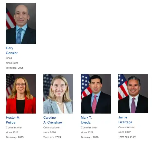 * P- J+ T$ B$ t! B+ @( }根据 FOX 记者 Eleanor Terrett 的介绍,可参与 ETF「生死」决议的投票人为 SEC(全名「美国证券交易委员会」)的五大现任委员,包括主席 Gary Gensler,以及四位委员 Hester Peirce、Caroline Crenshaw、Mark Uyeda、Jaime Lizárraga。