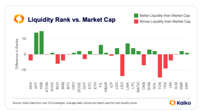 " u; _9 G( h4 }. {7 a, ~" ]一个简单的在家实施的指数投资策略可能是监控 Kaiko 的流动性列表,并按季度进行重新平衡。如果你购买流动性排名高于市值排名的绿色资产,卖出市值排名高于流动性排名的红色资产,那么你基本上就复制了我今年迄今为止的大型资产长 / 短名单(当然,这不是投资建议)。  资料来源:Kaiko ; _ y( K3 J& H